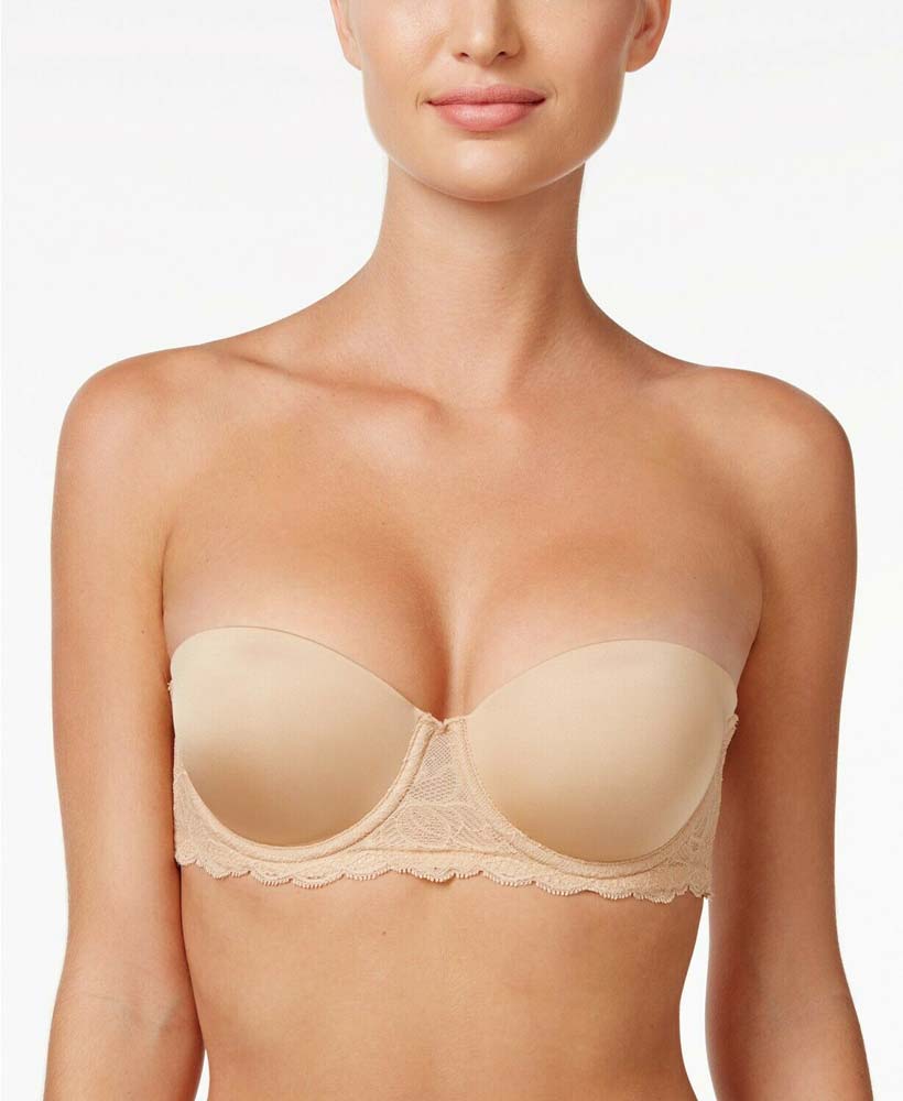 Calvin Klein Strapless Bra Seductive Comfort range ensures support with padded cups and a wide band to hold the strapless bra. Features lace details, adjustable straps, back cushion hook, and eye closure.
